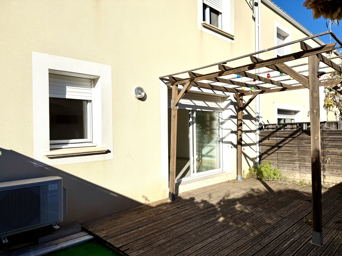 JUVIGNAC- CENTRE -Dans un lotissement situé 800m du centre et des commerces Maison T3 de 2009 en R+1 de 72m², jumelée des deux côtés. comprenant en rez de chaussée un séjour donnant sur une terrasse de 15m² et son jardin 32m², une cuisine séparée et un wc . Et à l'étage deux chambres , une salle de bains . Ainsi qu'un garage.